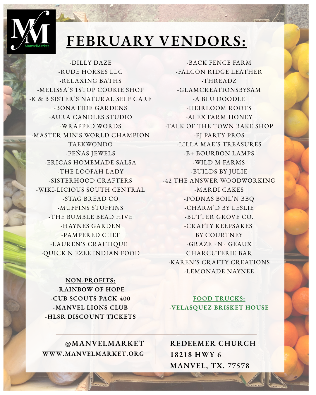 Join us for our February market featuring a great mix of vendors you know and love, along with some new additions to the market. Shop fresh food, baked goods, handmade items, self-care products, local farms, nonprofits, and enjoy a food truck favorite — all in one place.